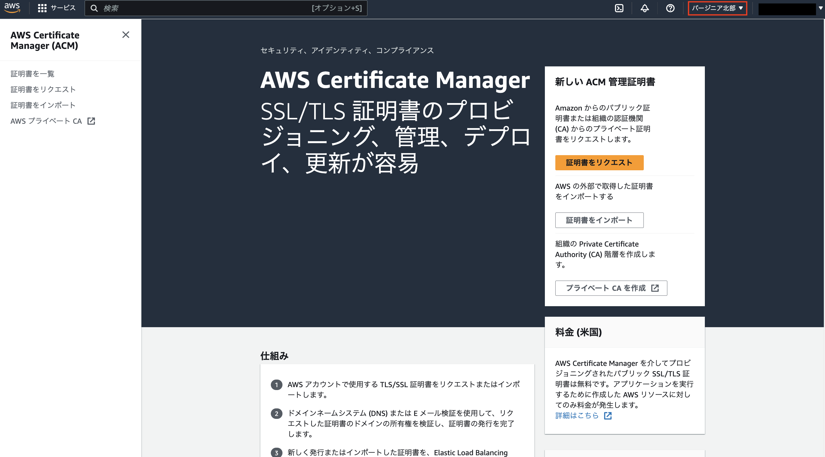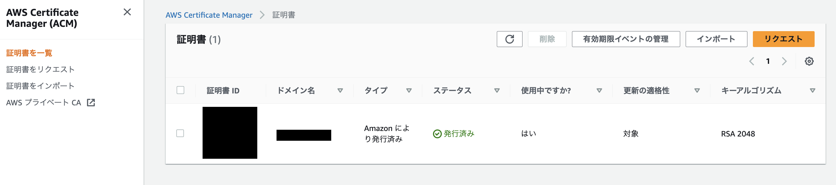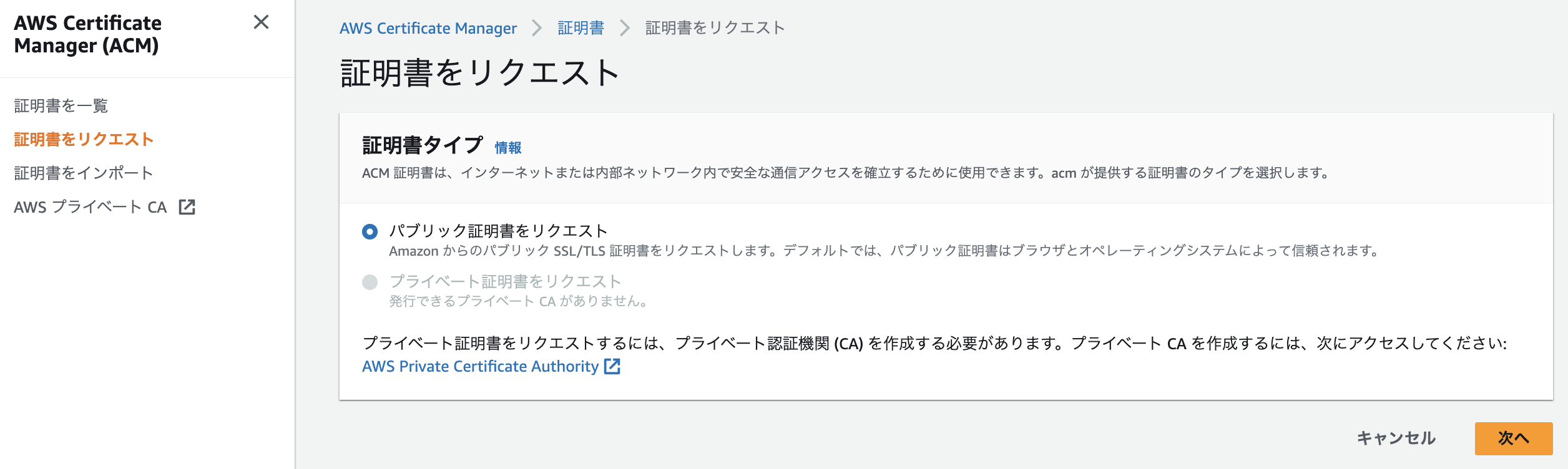 - マネジメントコンソールから AWS Certificate Manager のページへ