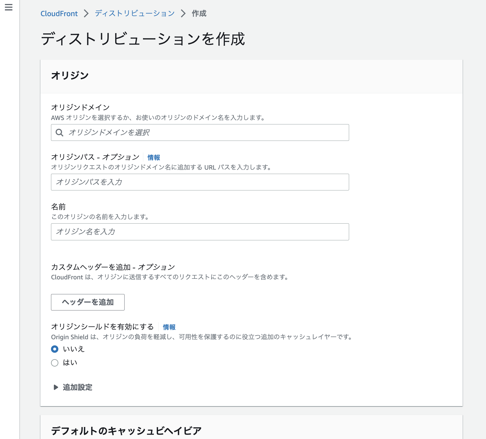 - オリジンシールドを有効にする:いいえ
