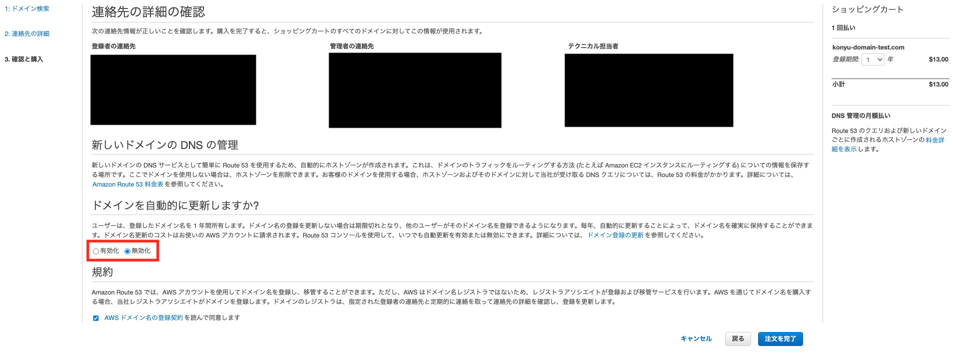 ※ 「ドメインを自動的に更新」の欄は確認しておく。