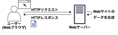 流れとしては、ユーザーが Web ブラウザから指定した Web サイトを開こうとすると、その Web サイトがある Web サーバーにリクエストが送信される。Web サーバー側はそのリクエストを受信し、その Web サイトを構成するデータ(html ファイルなど)をユーザー側にレスポンスとして返す。そのレスポンスを Web ブラウザが受け取り、Web サイトを表示するという仕組みになっている。
