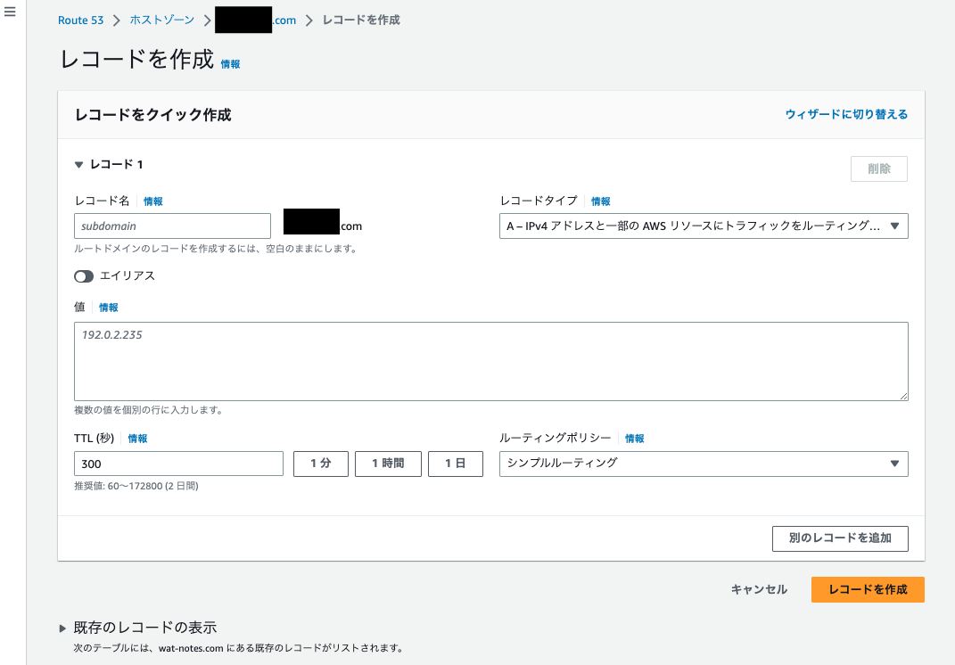 - レコード名は ACM,CloudFront で設定したドメイン名を入力