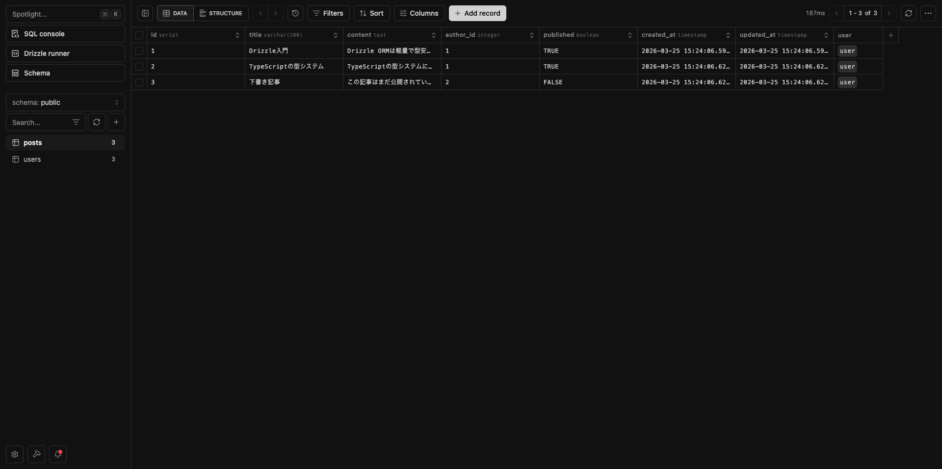 ブラウザで https://local.drizzle.studio が開き、テーブルの閲覧・編集が GUI で行えます。開発中のデータ確認に非常に便利です。(※ CLI 実行時に自動でブラウザが開きます)