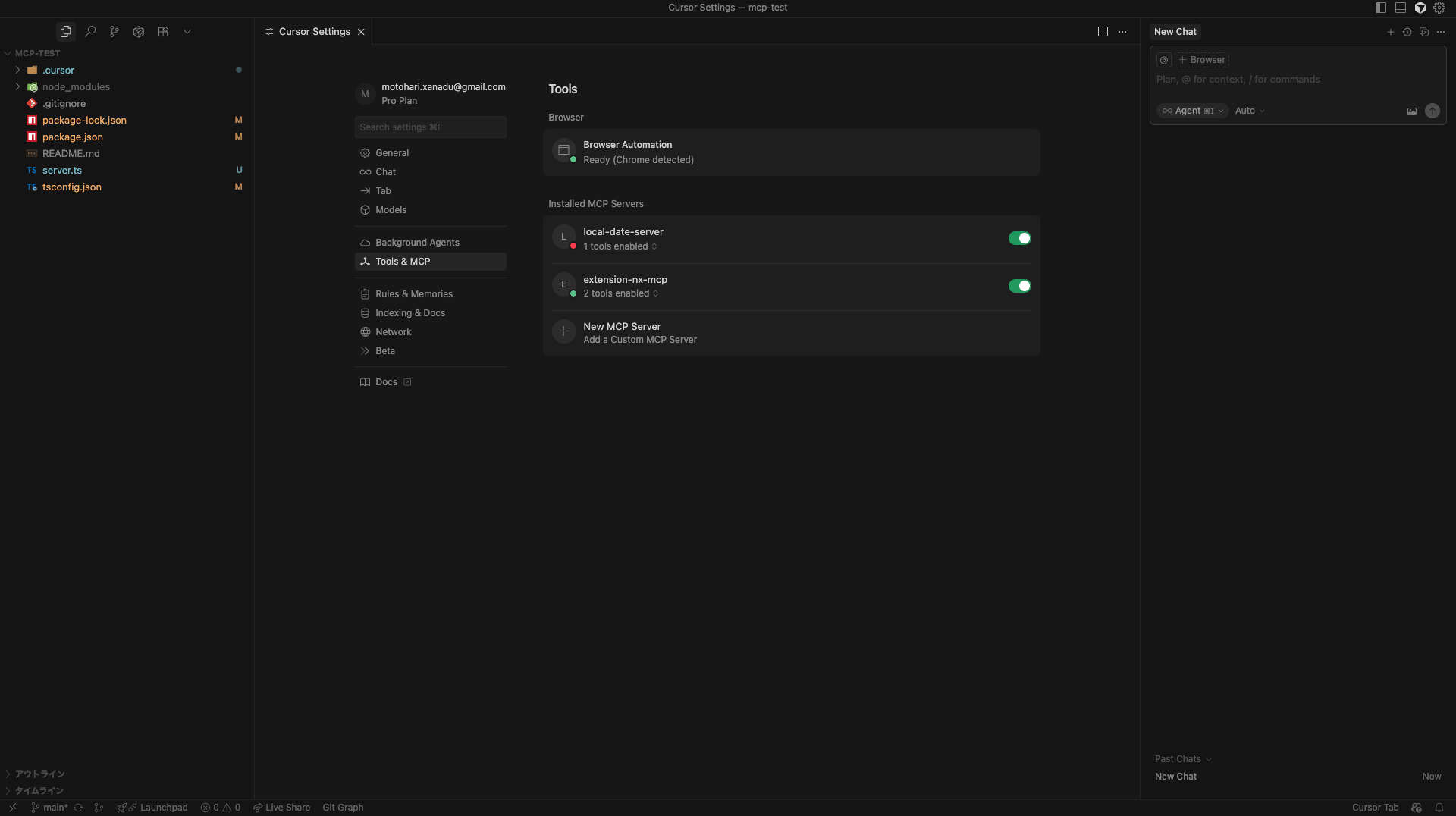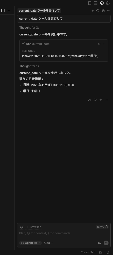 ここでまず、Cursor ではあなたがチャットに「current_date ツールを実行して」と入力すると