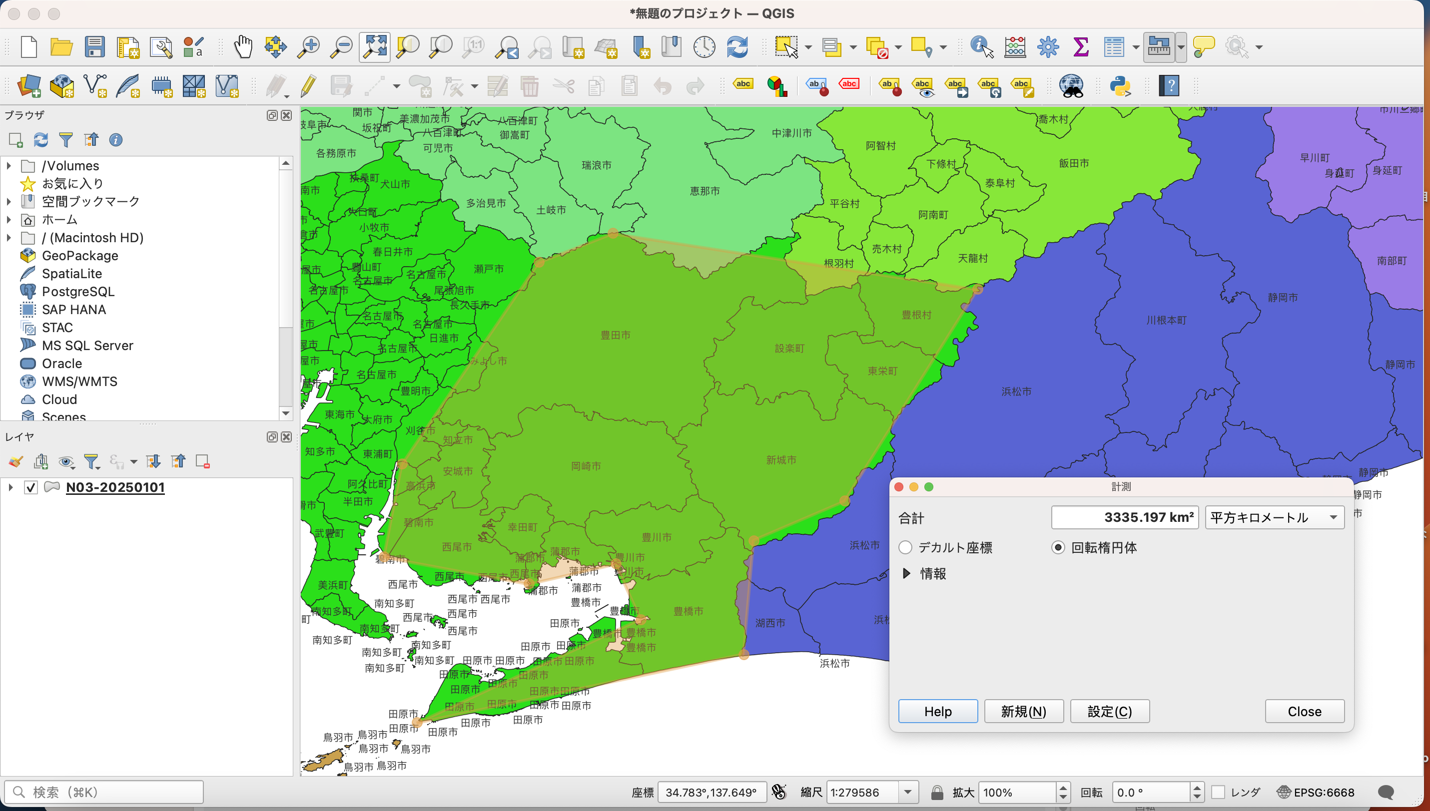 開始点に戻って右クリックすると面積が平方キロメートル単位で表示されます。