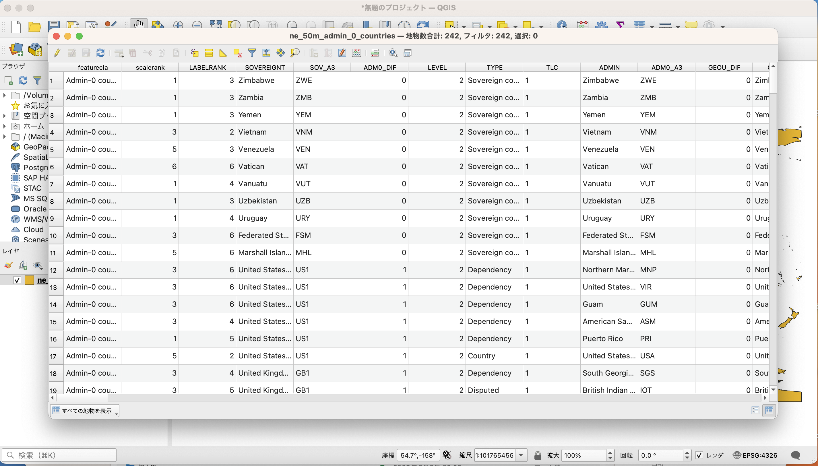 「レイヤ」メニューから「属性テーブルを開く」を選択すると、各国の名前や人口などの属性データを確認できます。