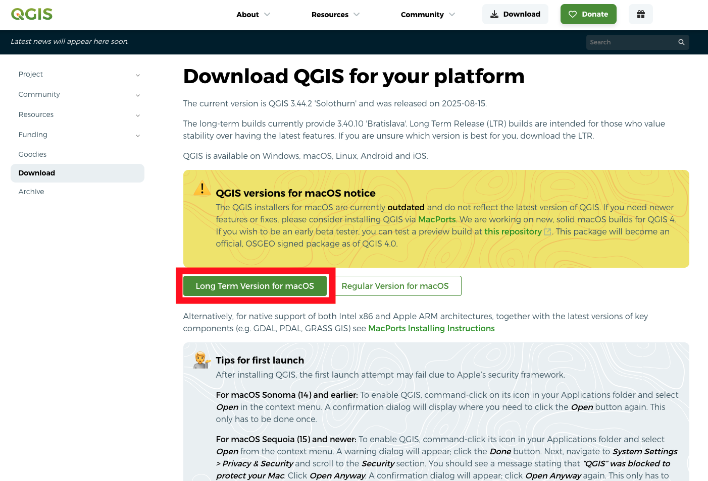 QGIS 公式ページ1 から「Download for macOS」を選択
