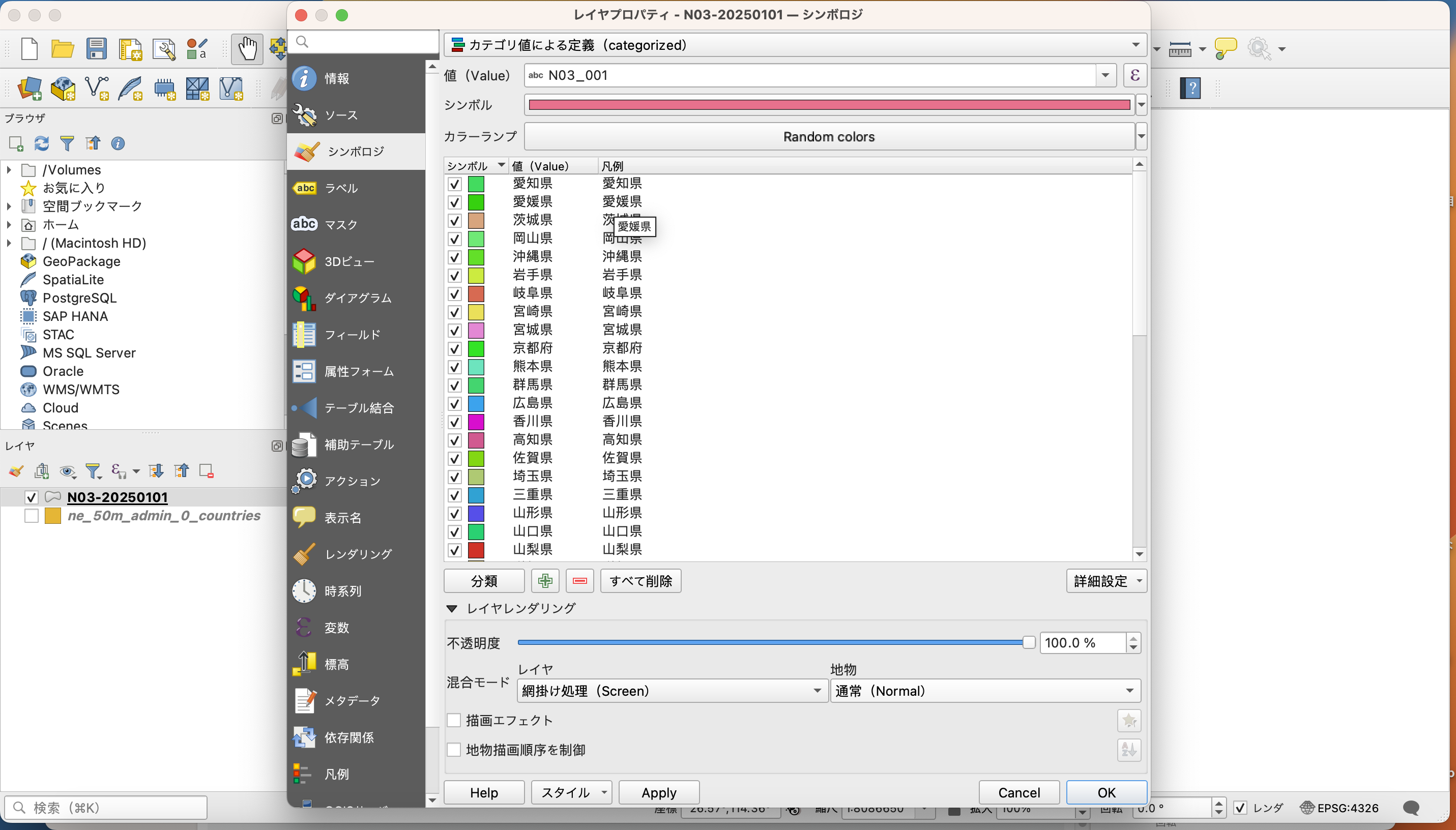 前回と同様にベクタレイヤーでダウンロードした日本の都道府県データを読み込みます。