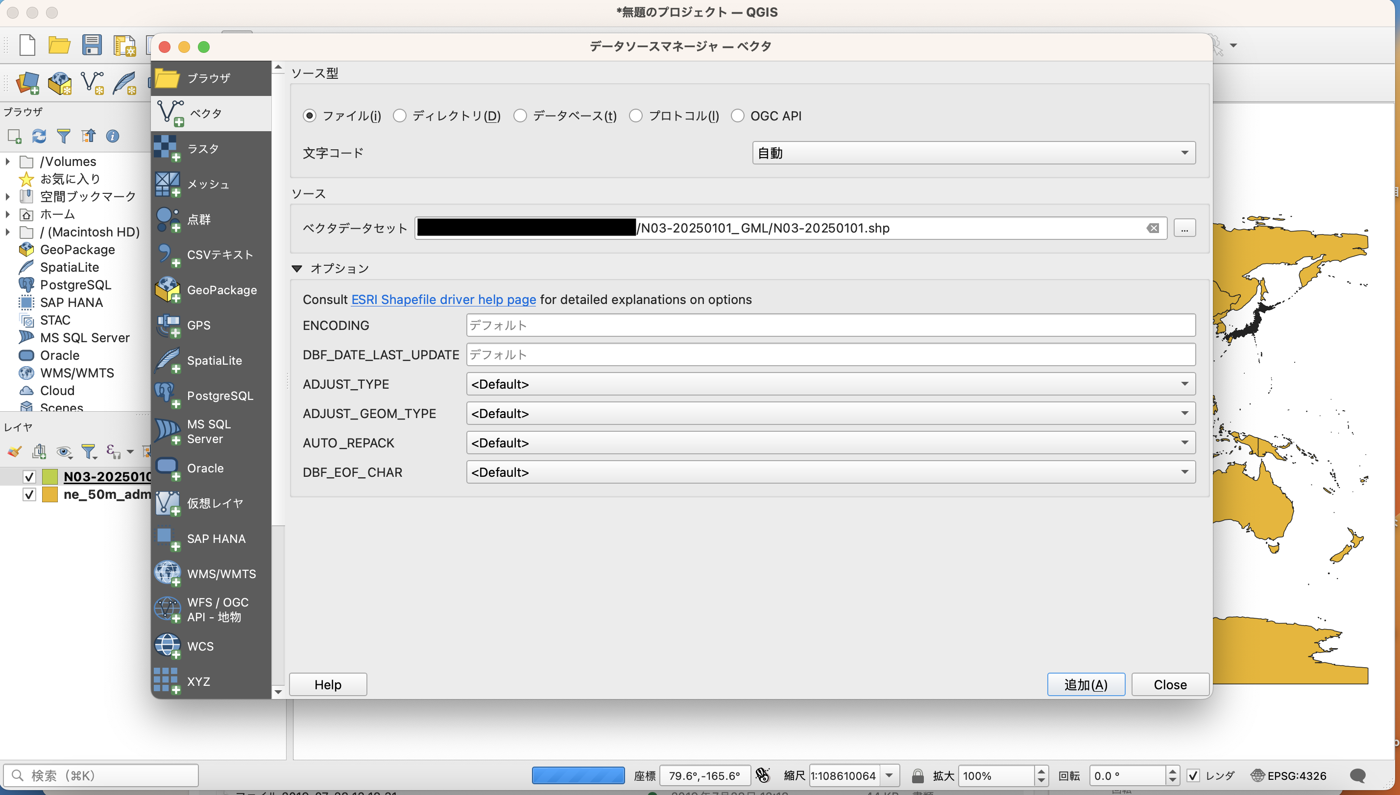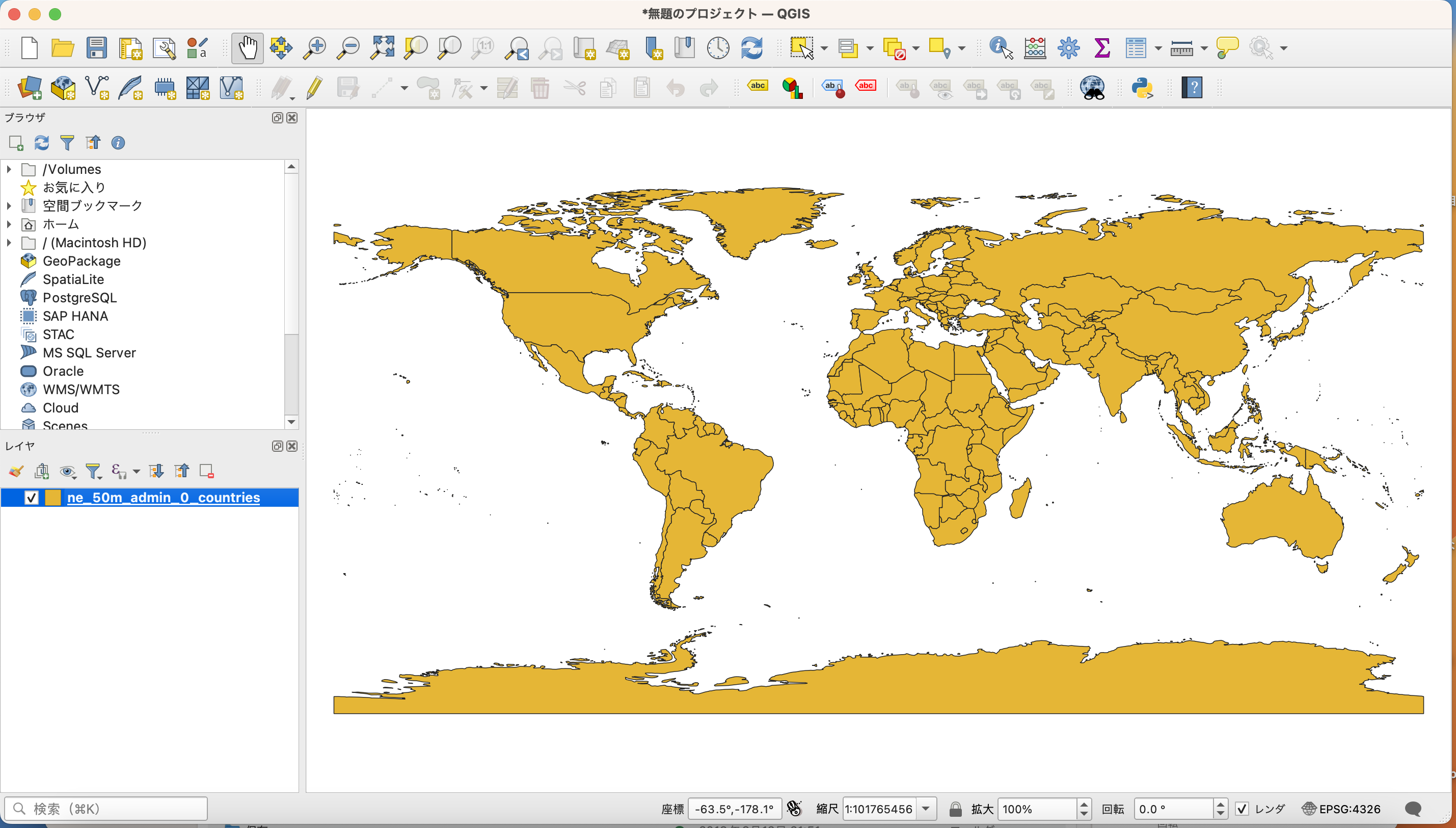 ダウンロードした Natural Earth の shape ファイル(.shp)を選択