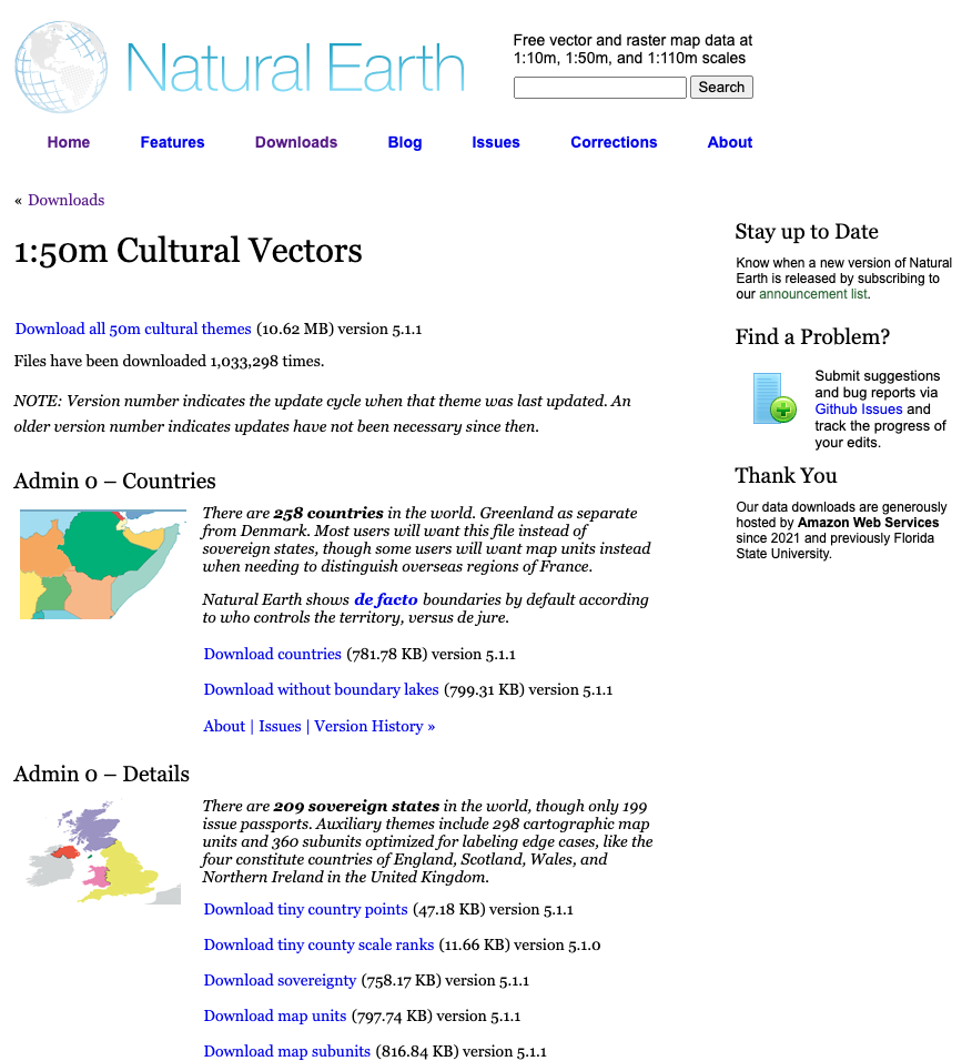 - 「Downloads」→「Cultural」→「Admin 0 - Countries」を選択(Cultural は縮尺ごとに分かれているので、任意のものを利用可能)