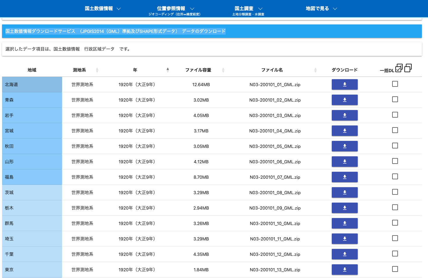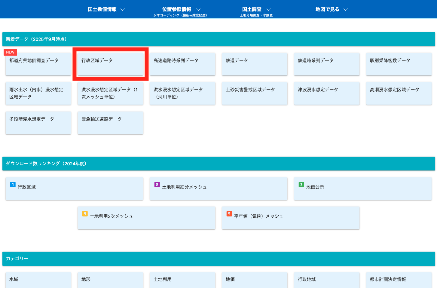 「行政区域データ」→「国土数値情報ダウンロードサービスデータのダウンロード」を選択してダウンロード(種類はどれでも良いですが、ここでは全国データを扱います。)