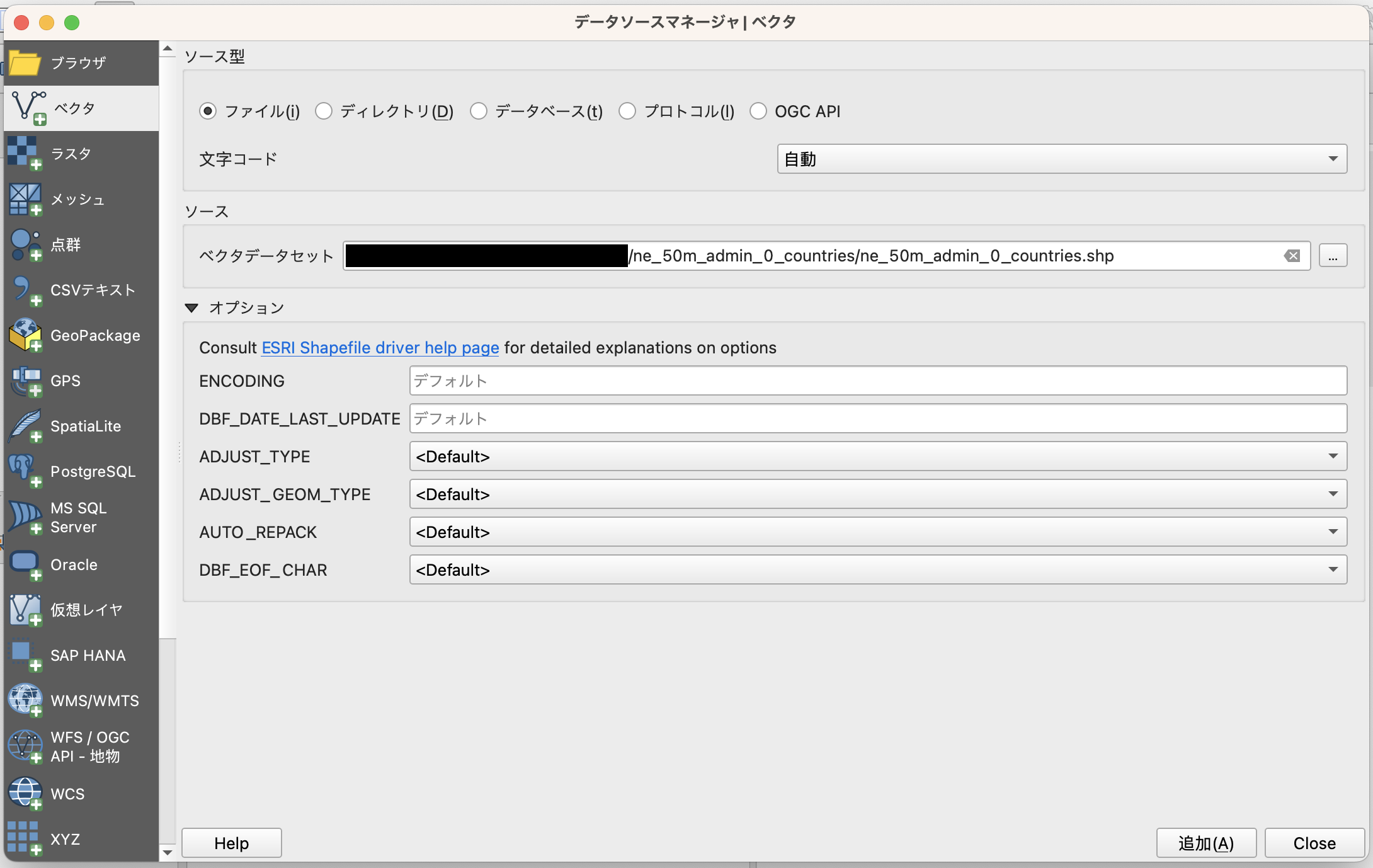 「レイヤー」メニュー →「データソースマネージャ」→「ベクタ」